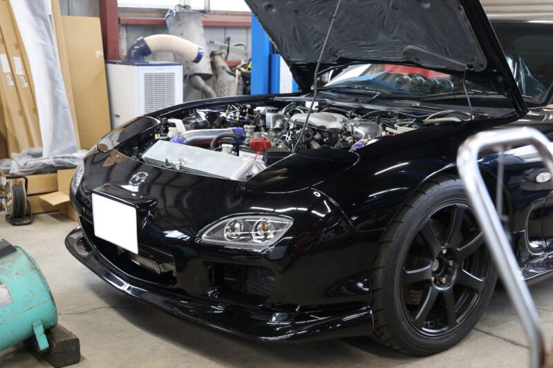 フルタービン化に加え、冷却系も抜けなくアップデート。850cc4本のインジェクターを使用し、制御はApexiのパワーFCです。バッテリーに関しては本来装着する予定のものが、現在納期が大幅に遅れています。そのため、慣らしの間は従来の鉛バッテリーを使用し、進めていただきます。(すみません…)
