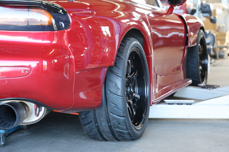 まずはFD3S RX-7の入庫。走行会シーズンに向けて、タイヤの新調のご依頼をいただきました!