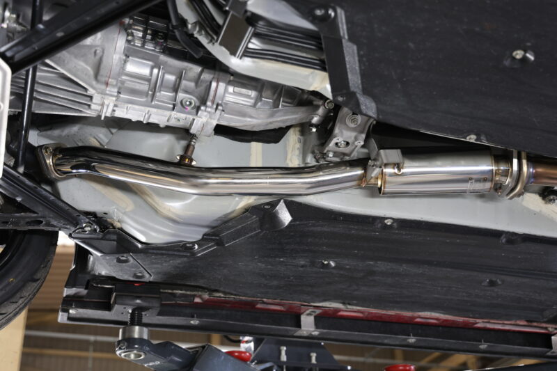 サーキット専用車両としての排気系にはまだ改善の余地があるということで、輸出AT用のフロントパイプ(センターパイプ?)へ交換して再テストを行いました。再びダイノにセットしてチェック。