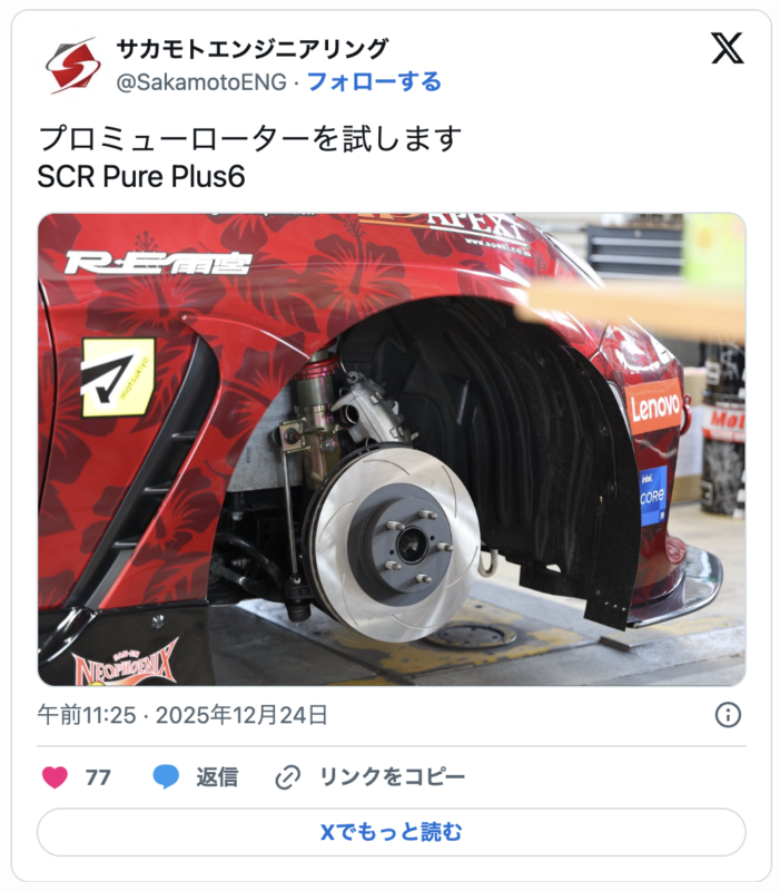 そのため、ローターは再度エンドレス製へ戻す方向になります。早速パーツの手配をしましたが、入荷まで少し時間がかかる見込みのため、次回の走行を予定している富士や再度筑波には間に合わなそう…。なので、手持ちの中古エンドレスへ戻すか、このまま引き続き検証していくかは別途検討します。