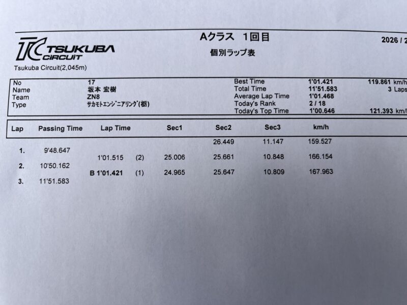 今回は先の仕様変更に伴う確認テストが目的ではありますが、当時と比べて仕様やセット含めた変更点も多々あるし、日光やもてぎでの更新を考慮してもベスト更新は必須でしょう。(シバタイヤのR31の旧モデル:TW200での3秒5がベストタイム)