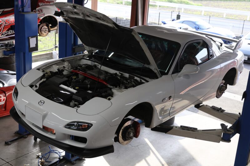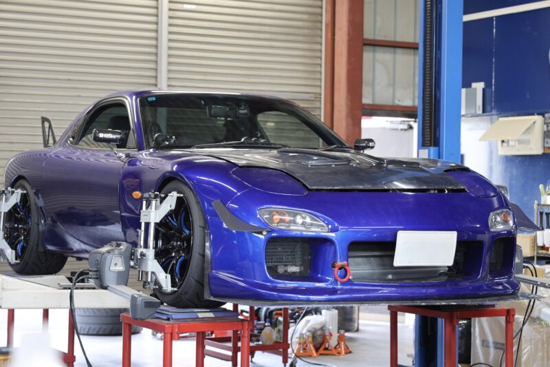 そして次も四輪アライメントの調整でFD3S RX-7の入庫です。こちらの車両は筑波サーキットのTC2000では58秒台を達成している車両です。