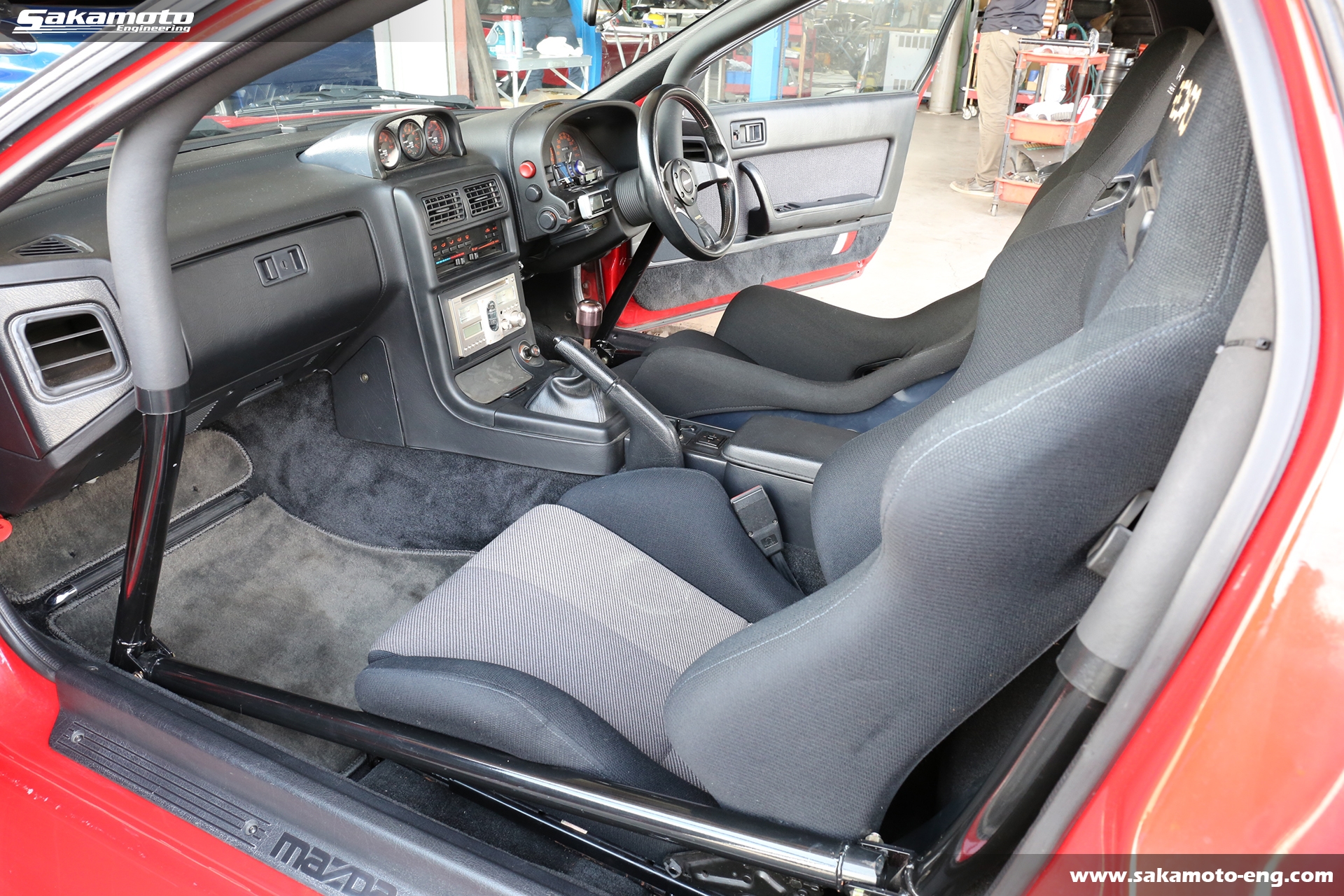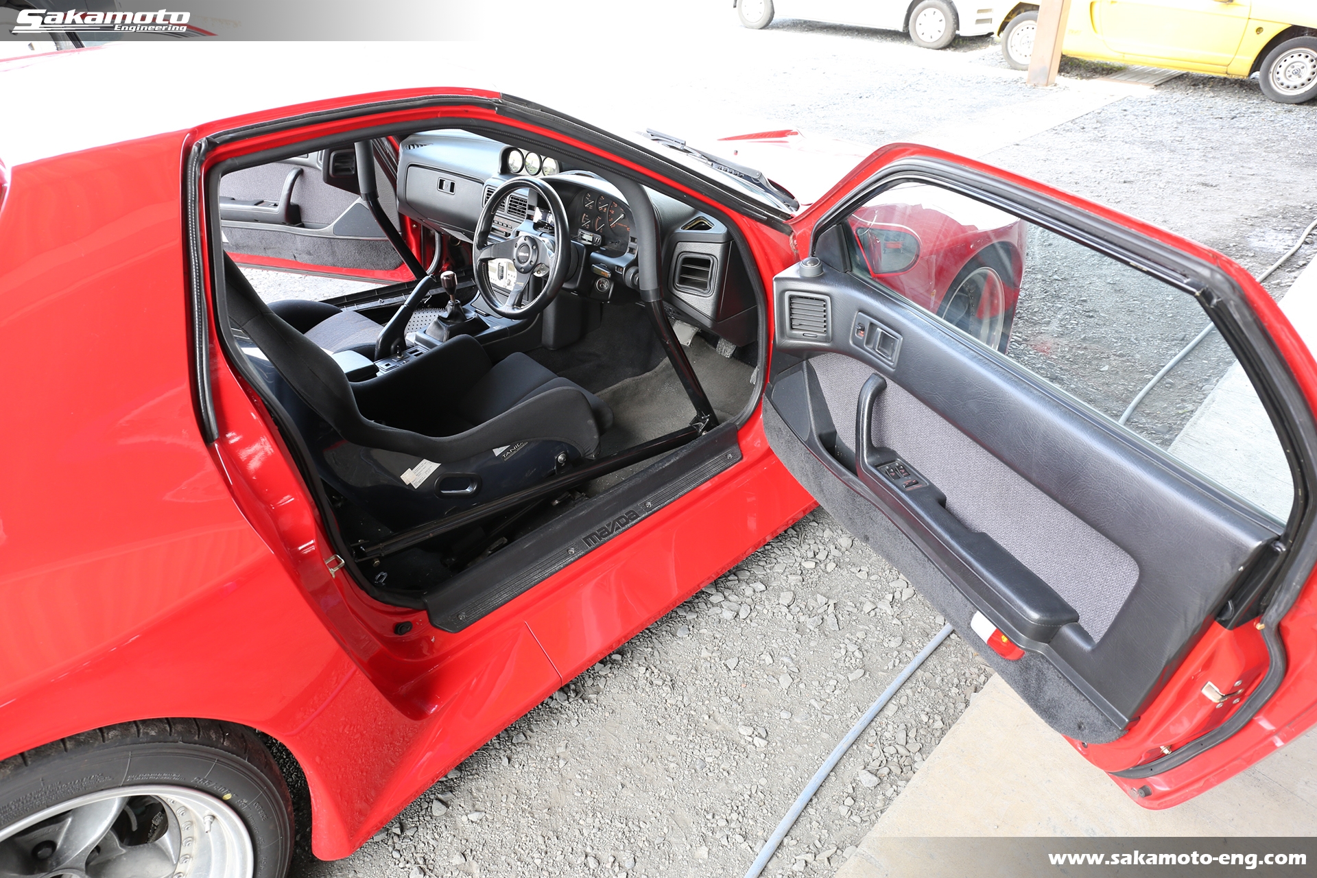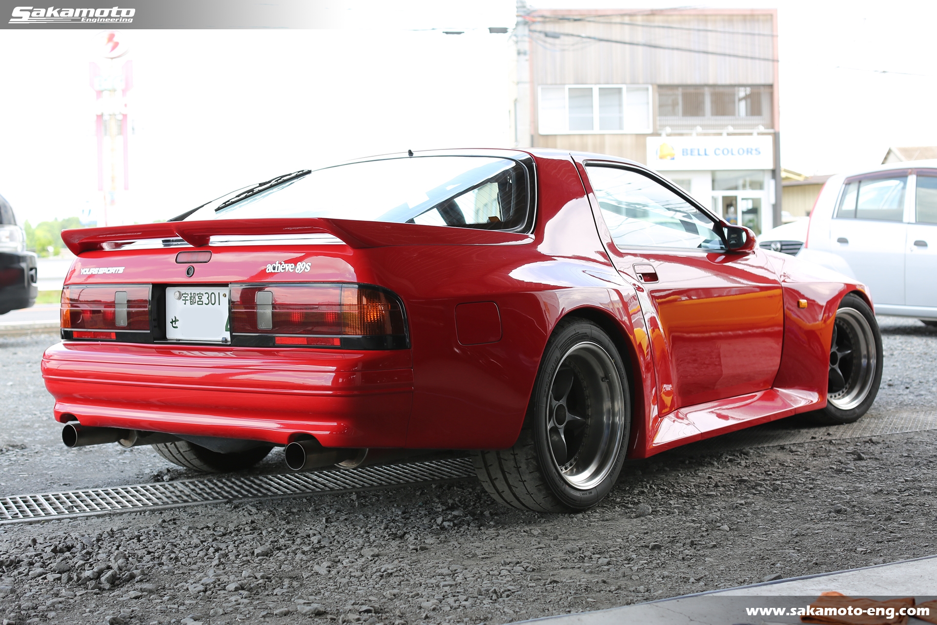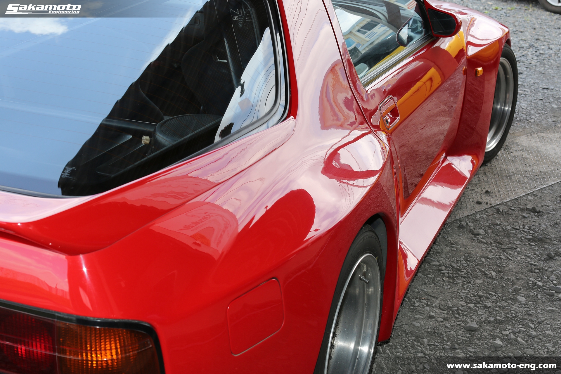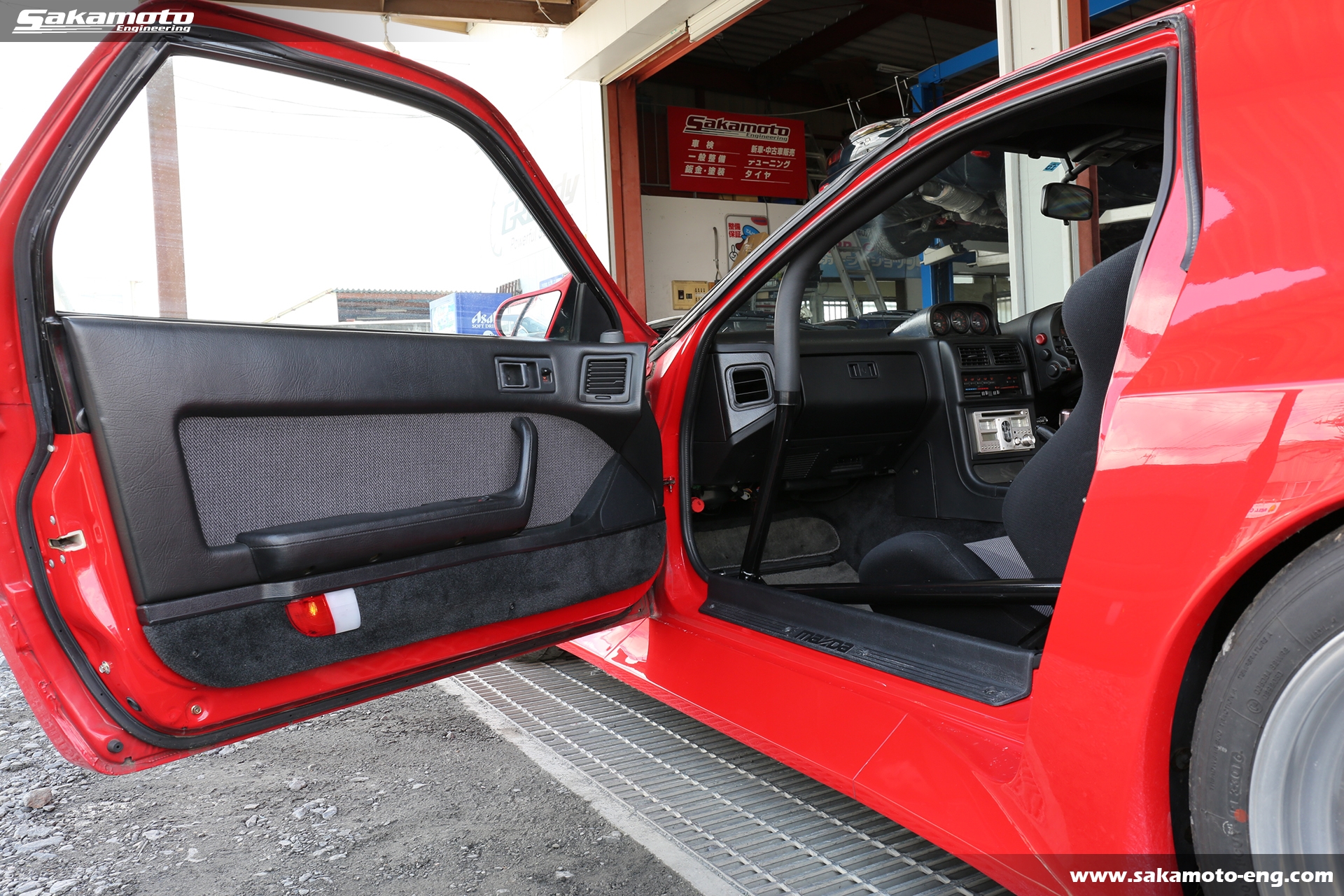 このFC3S RX-7はサカモトエンジニアリングのデモカーとして製作され、フルメンテナンスが行われています。車両はFC3Sの後期型(1991年生産の最終型)をベースに、絶版となったユアーズスポーツ製のボーグアチーブワイドブリスターボディ(acheve 89s)を装着。エンジンや駆動系、ブレーキ等についてはFD3S等の現代パーツで強化。ストリートからサーキットまで安心して走れる高品質なFC3S RX-7です。