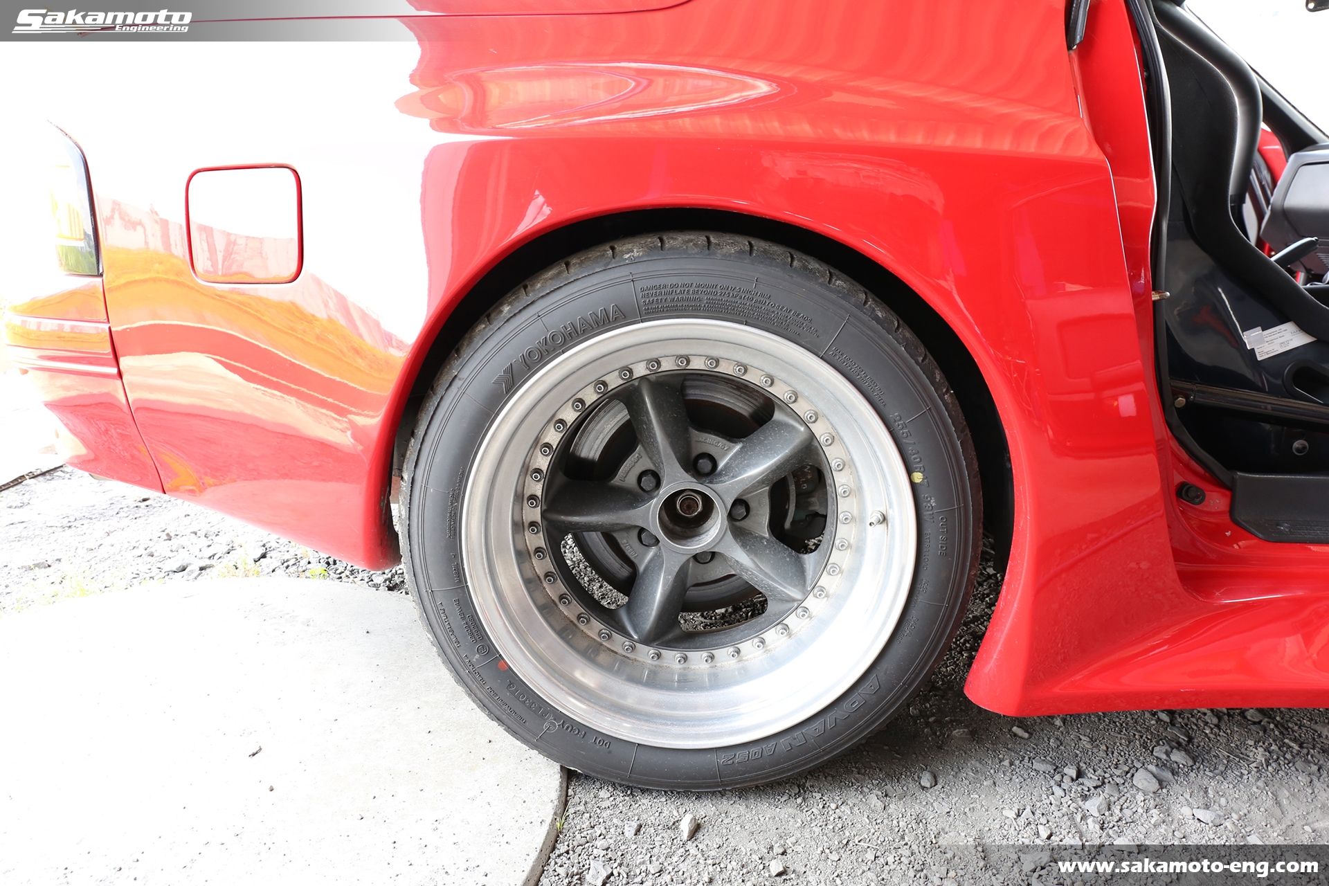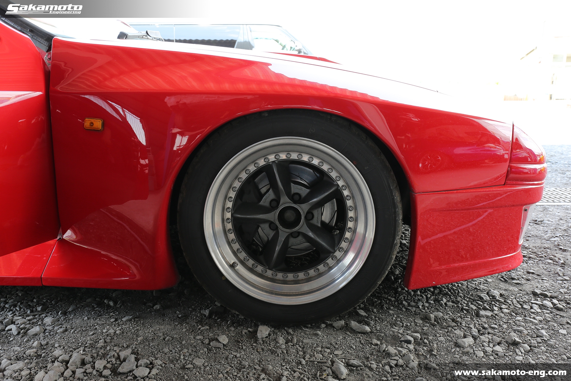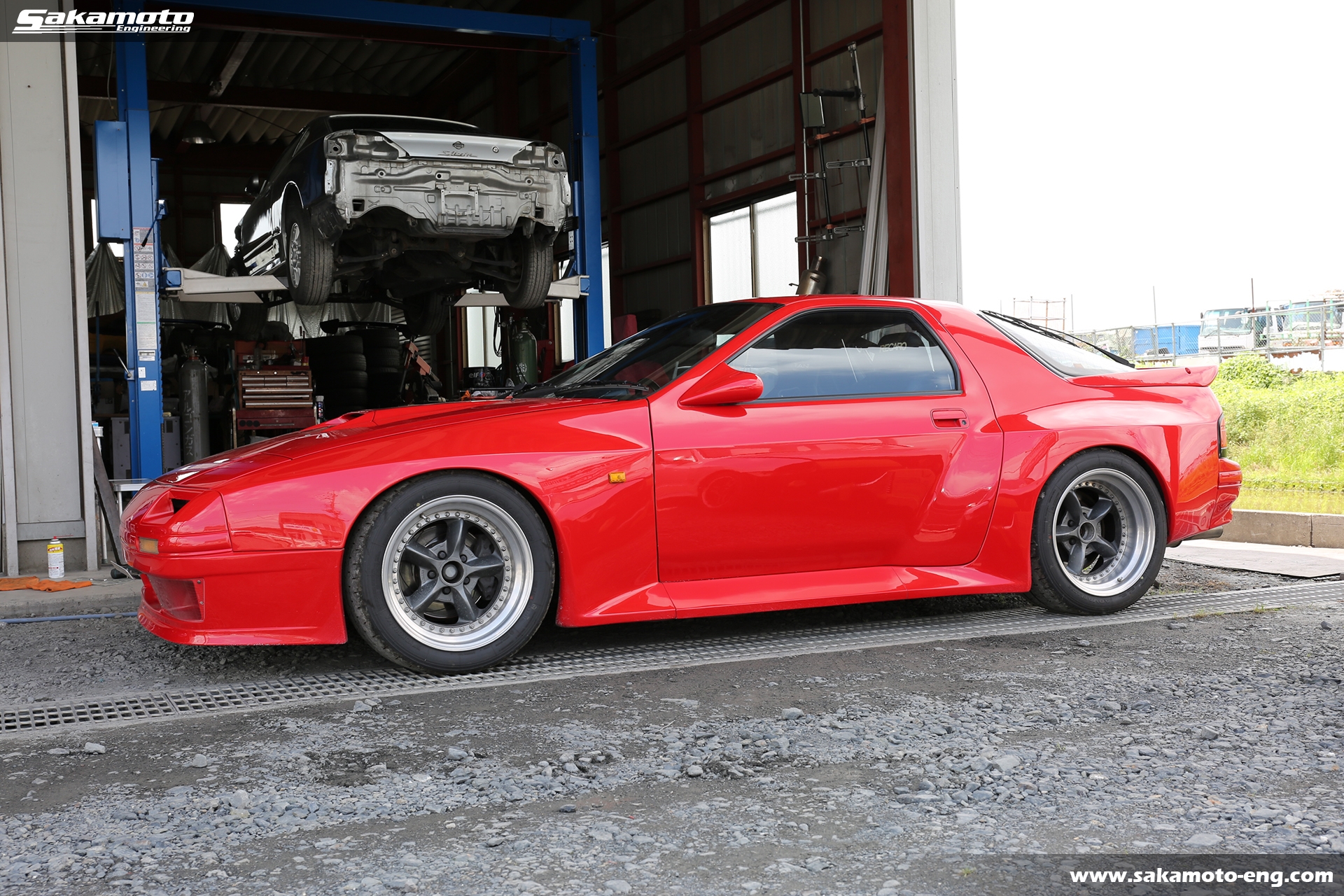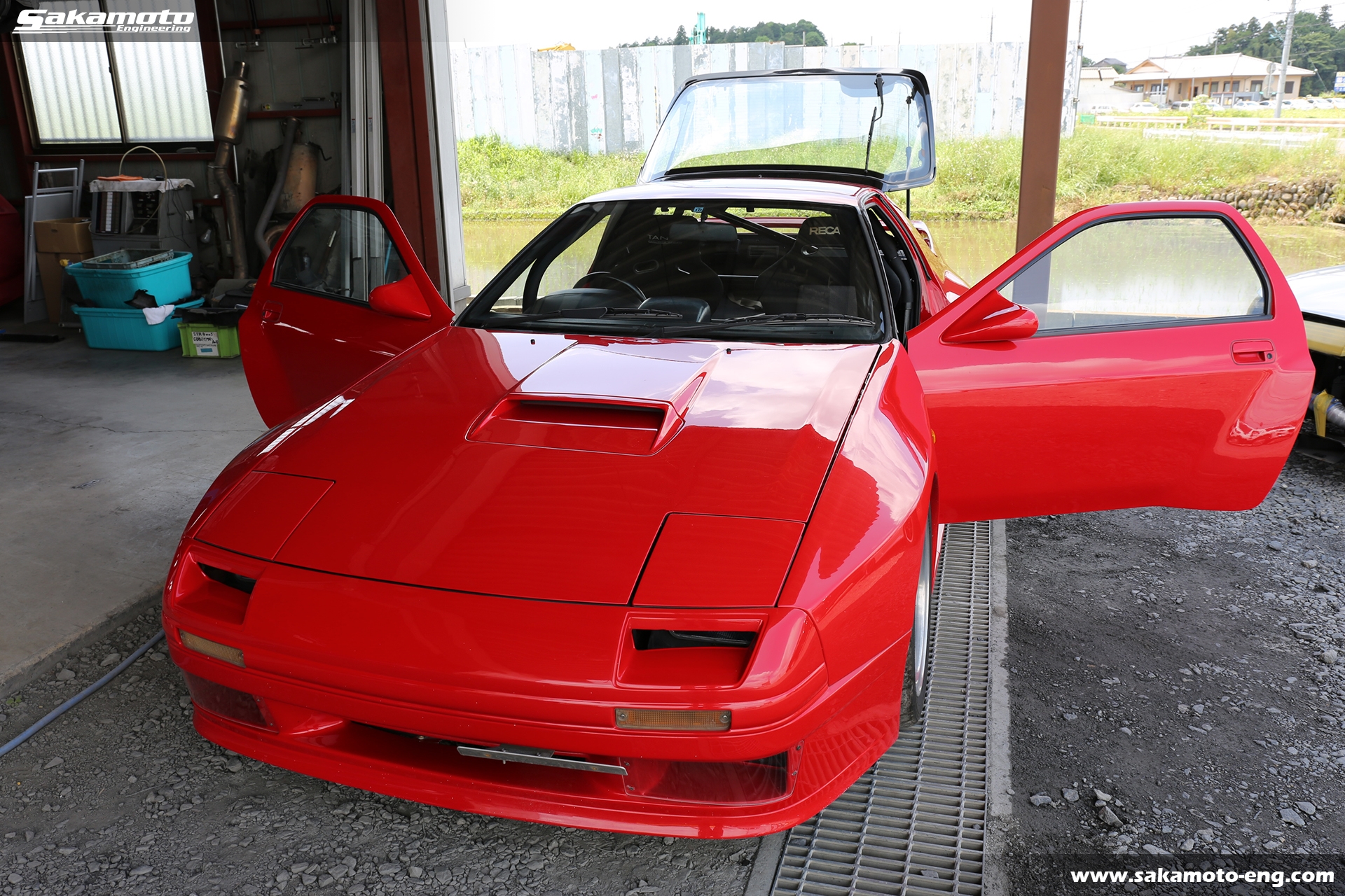 このFC3S RX-7はサカモトエンジニアリングのデモカーとして製作され、フルメンテナンスが行われています。車両はFC3Sの後期型(1991年生産の最終型)をベースに、絶版となったユアーズスポーツ製のボーグアチーブワイドブリスターボディ(acheve 89s)を装着。エンジンや駆動系、ブレーキ等についてはFD3S等の現代パーツで強化。ストリートからサーキットまで安心して走れる高品質なFC3S RX-7です。