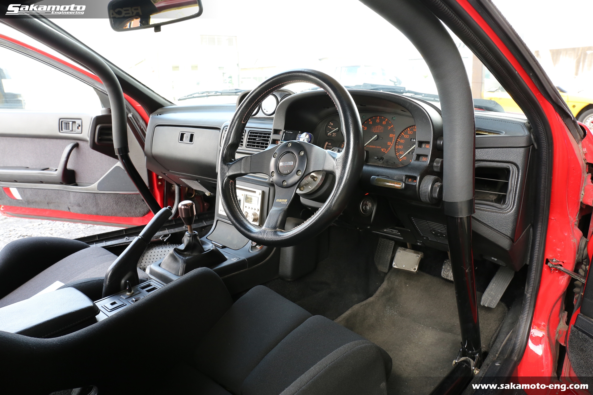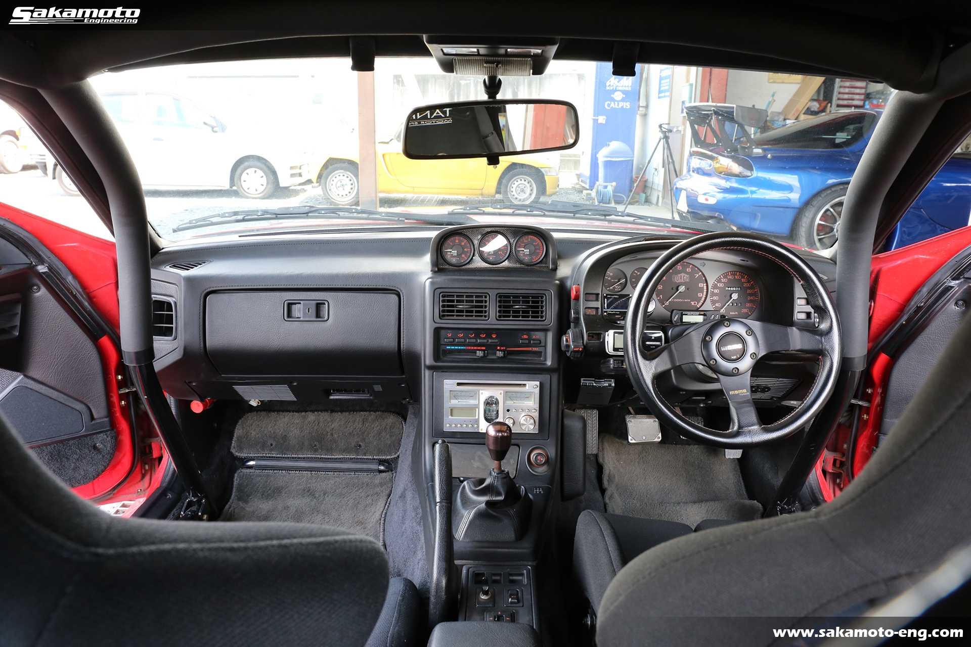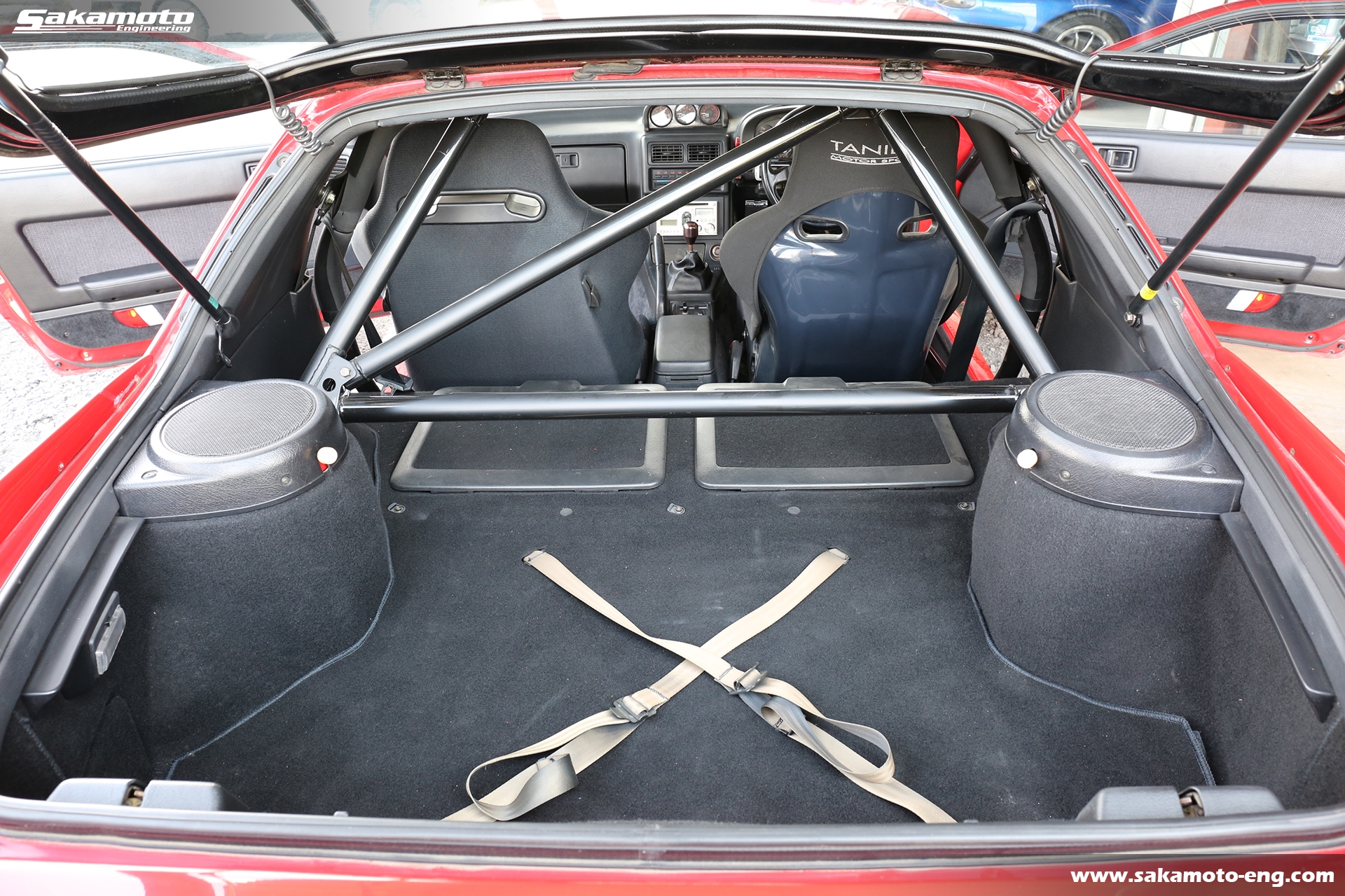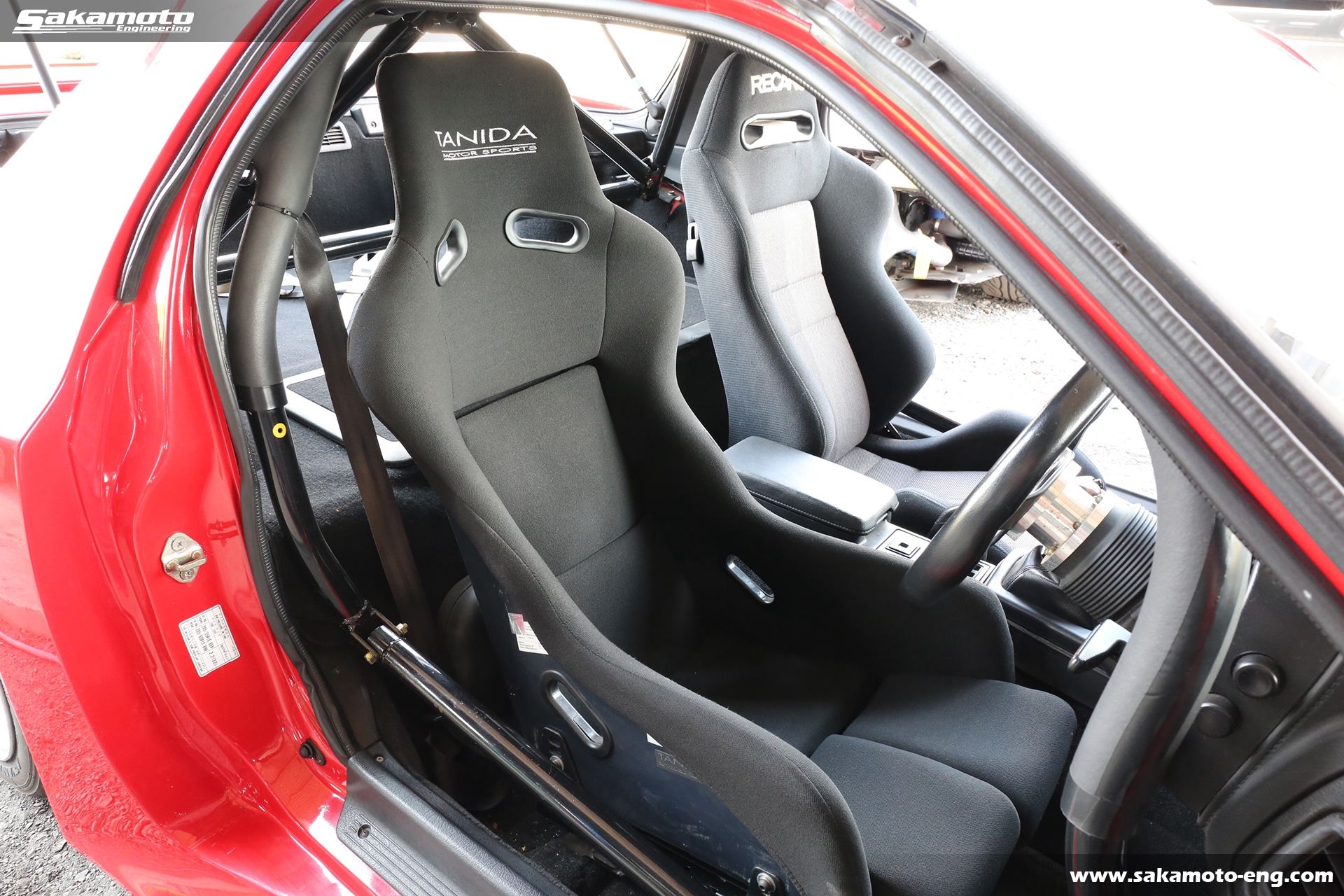 内装は10点式のロールケージと各種追加メーターが装着されています。シートは運転席がTANIDAのフルバケットシート、助手席がRECAROのセミバケットシートになっています。