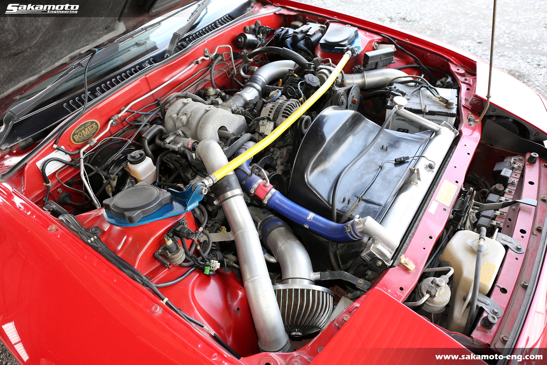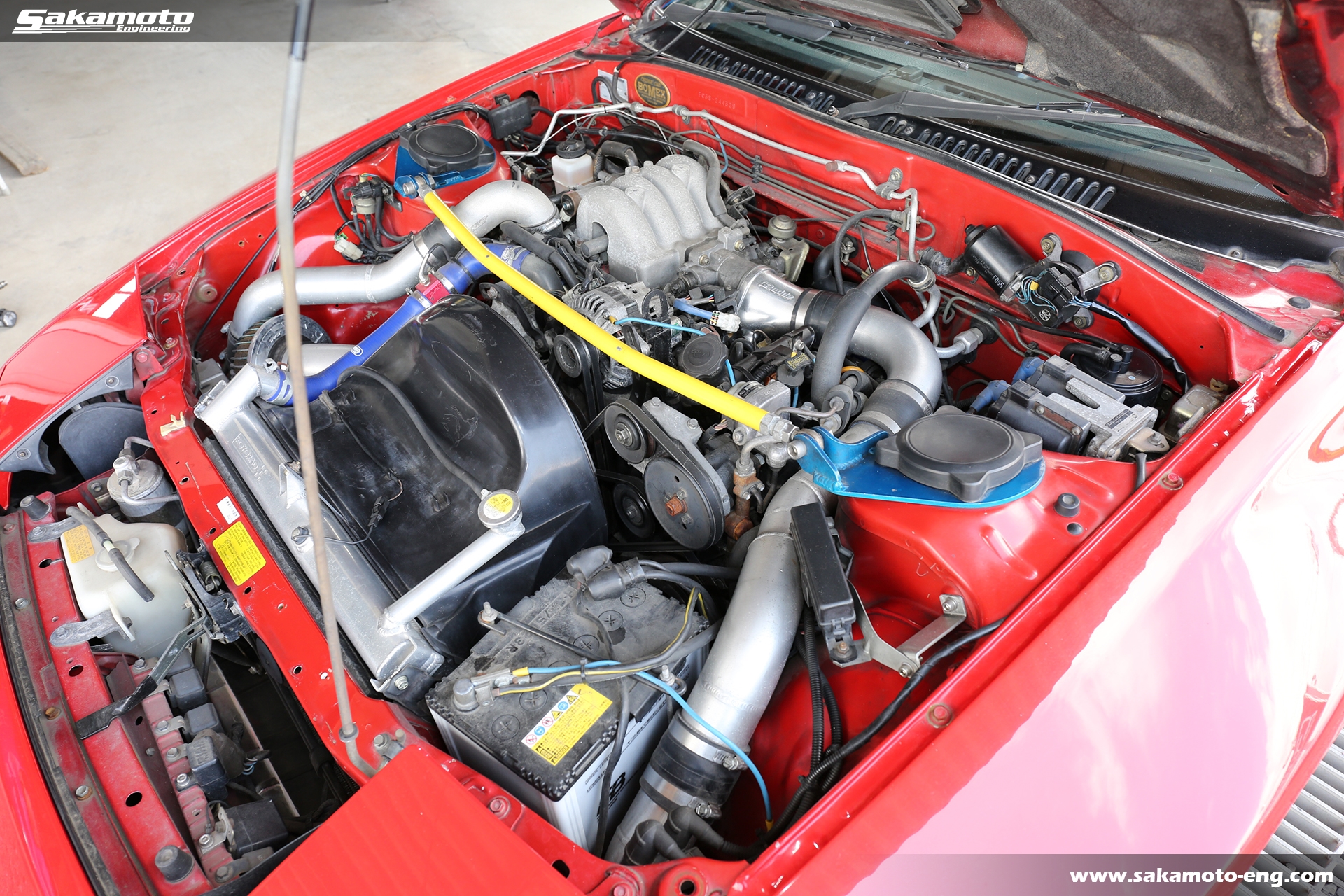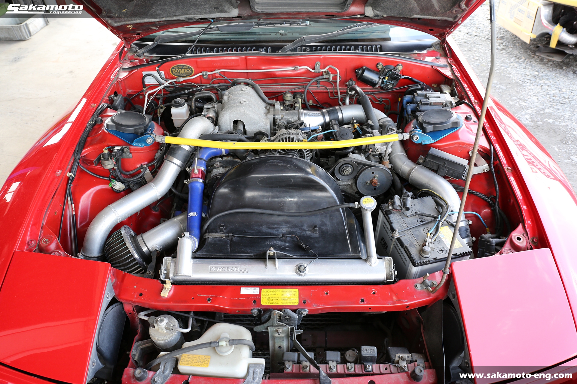 エンジンはエンジン本体・タービンともにノーマルです。吸排気系と冷却系を強化し、インタークーラーはトラストのVシステムインタークーラー、冷却にはトラストツインオイルクーラーとKOYOアルミラジエターを採用しています。