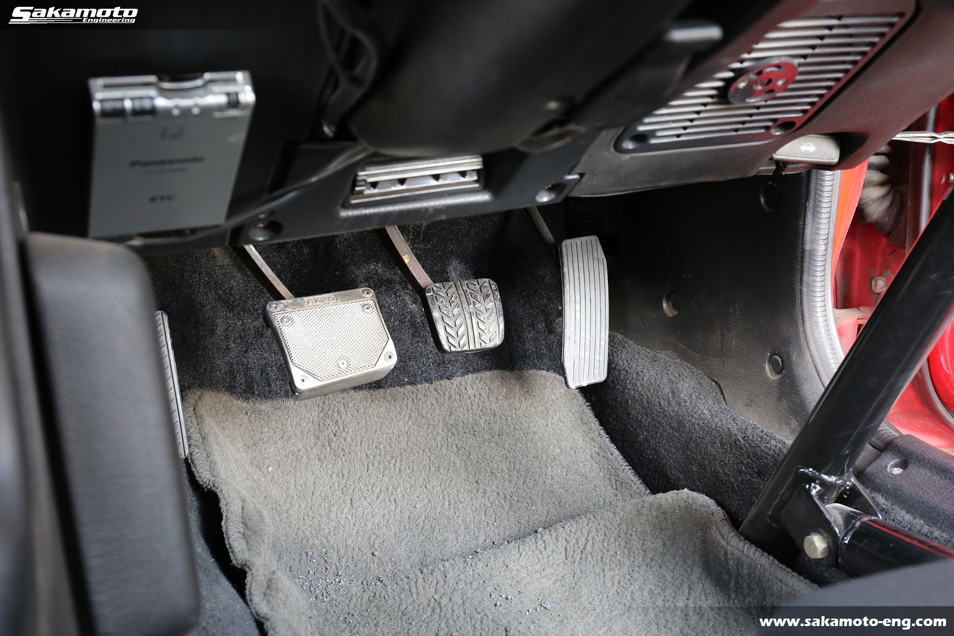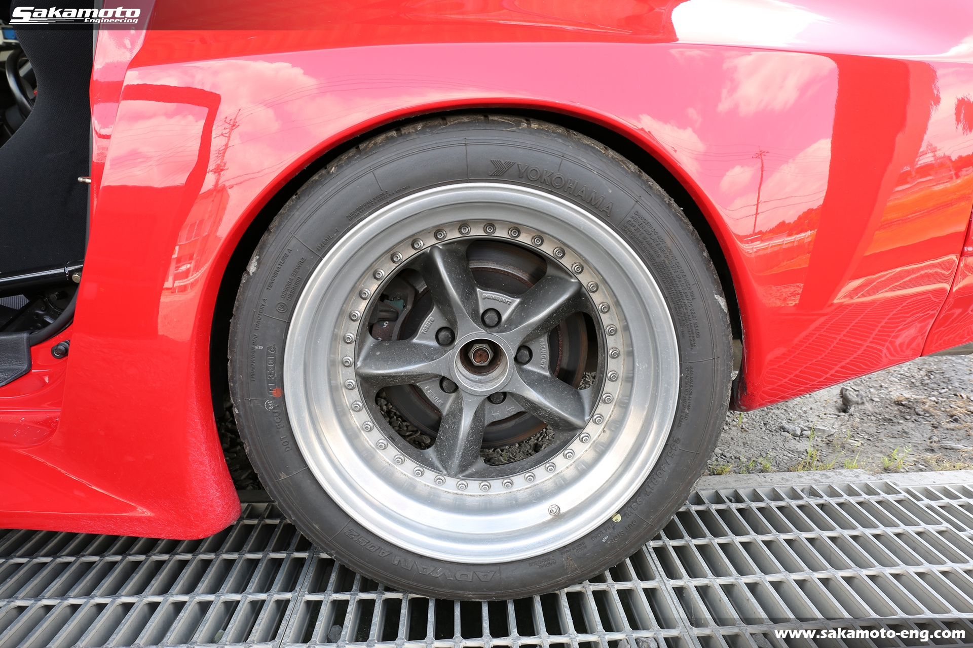 ホイールはパナG7 C5Rの特注サイズの17インチを装着しています。ブレーキは前後ともFD3S RX-7の17インチローターとアンフィニマスターシリンダー&マスターバックを採用しています。ブレーキパッドはZONEが付いています。