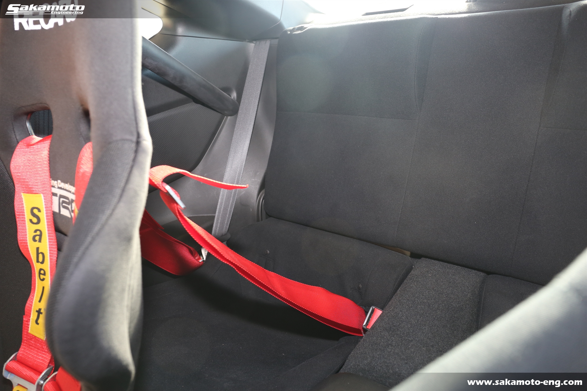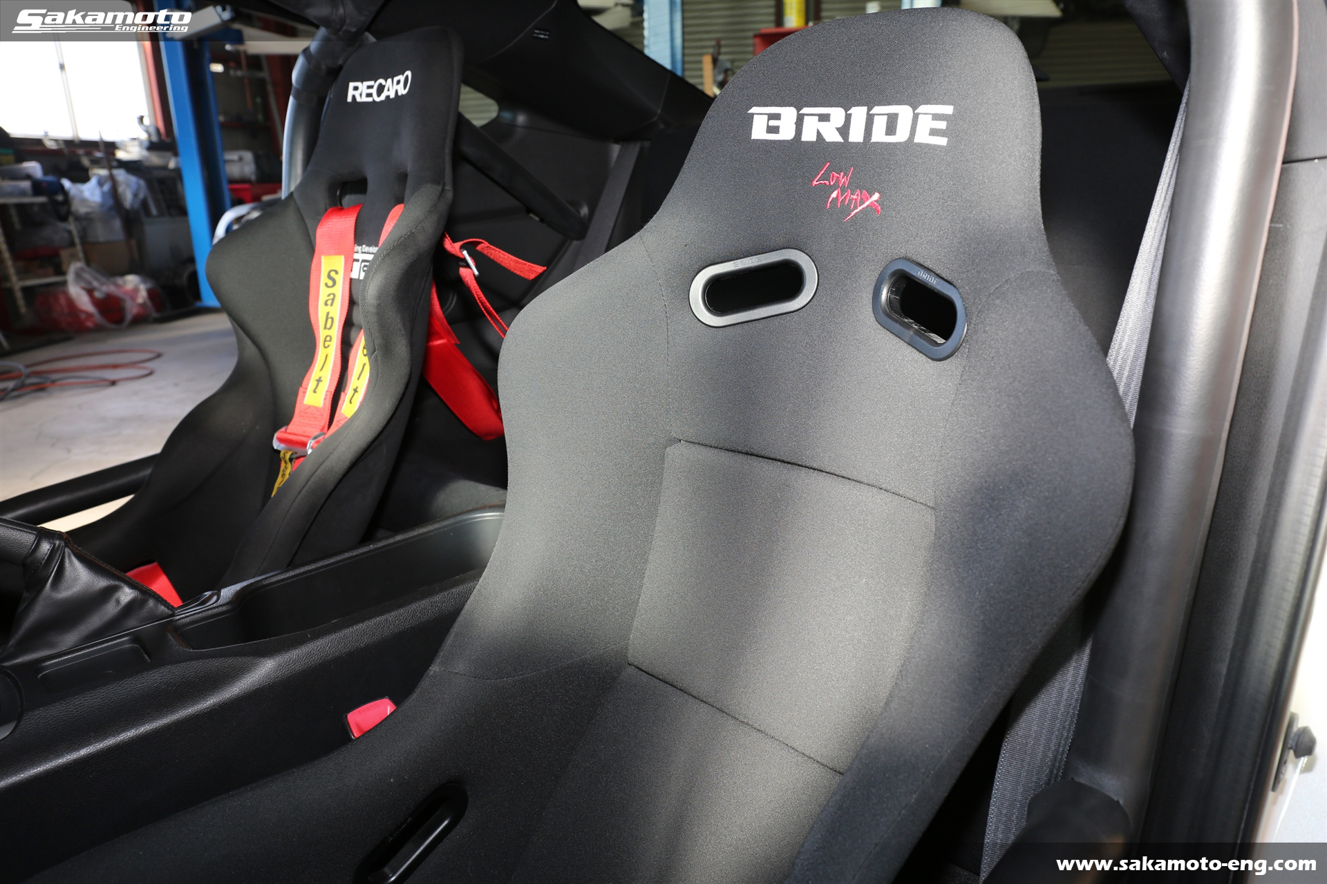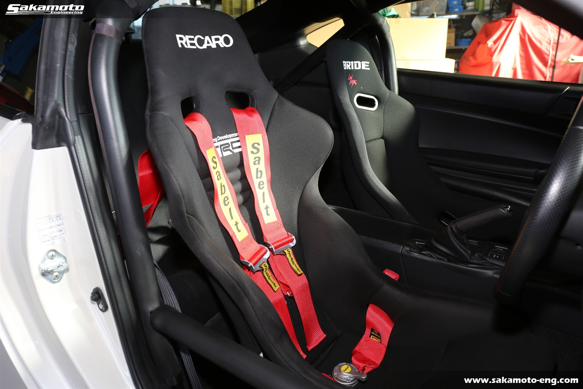 シートは運転席にRECARO製、助手席にBRIDE製のフルバケットシートが付いてます。運転席側には4点式のSabelt製レーシングハーネスが取り付け済みです。